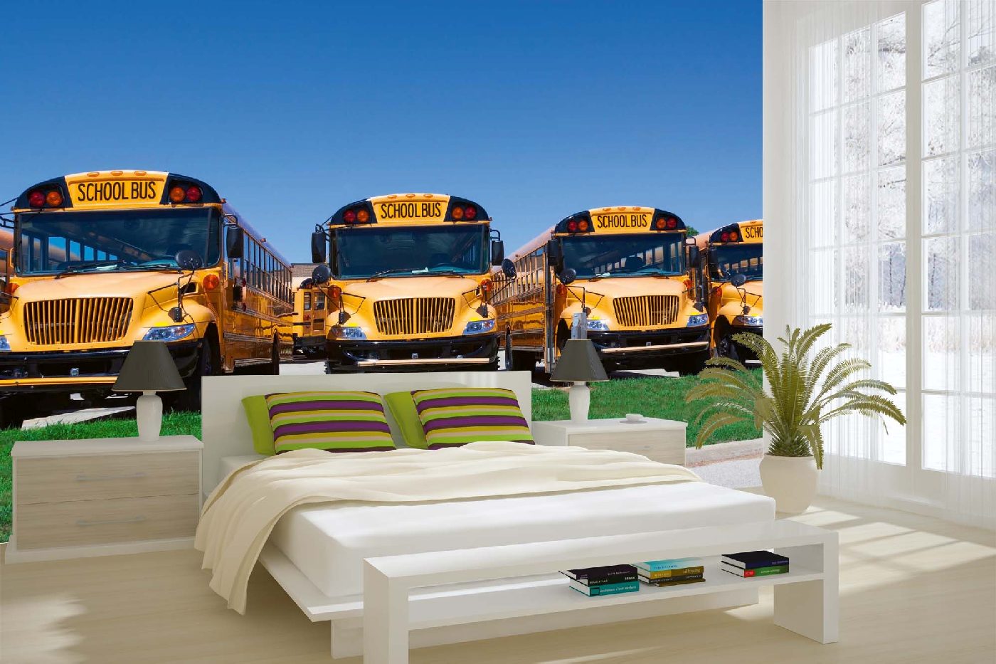 MS-5-2717 Nem szőtt fotótapéta Iskolabuszok sora - 375 x 250 cm