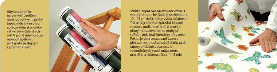 - V případě, že výrobní šarže na tapetách souhlasí, ale přesto se barva tapet se stejným číselným kódem vzájemně liší, role v žádném případě nestříhejte ani nelepte a obraťte se na prodejce. V případě nalezení jakýchkoli jiných vad či skvrn na povrchu tapety postupujte obdobným způsobem.
