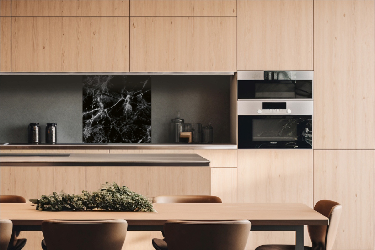 Dibond tábla a konyhapult mögött