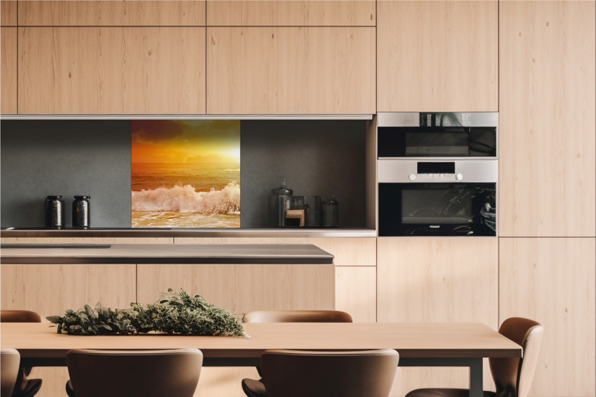 Dibond tábla a konyhapult mögött