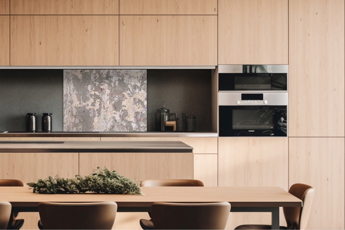 Dibond tábla a konyhapult mögött