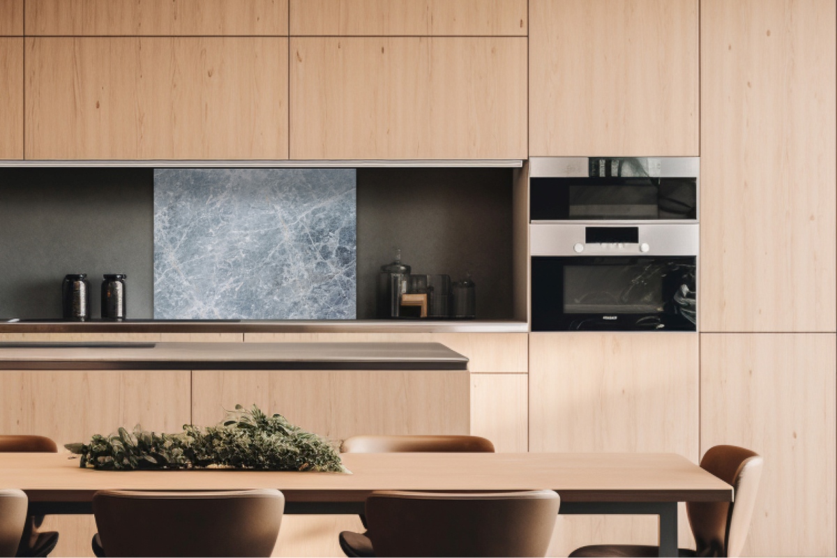Dibond tábla a konyhapult mögött