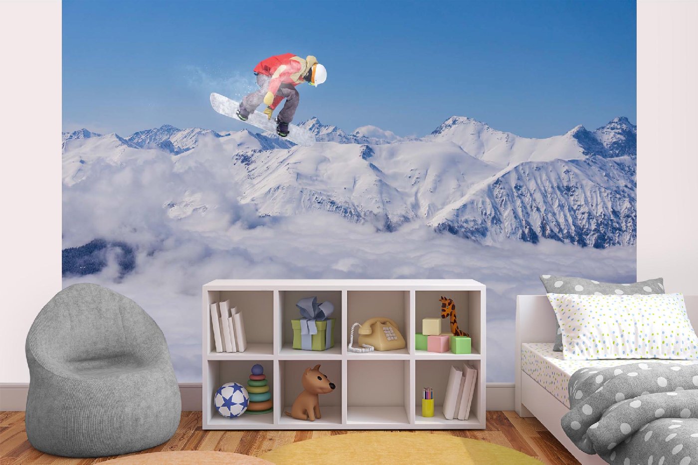 Öntapadós nem szőtt fotótapéta Repülő snowboardos a hegyekben 375 x 250 cm