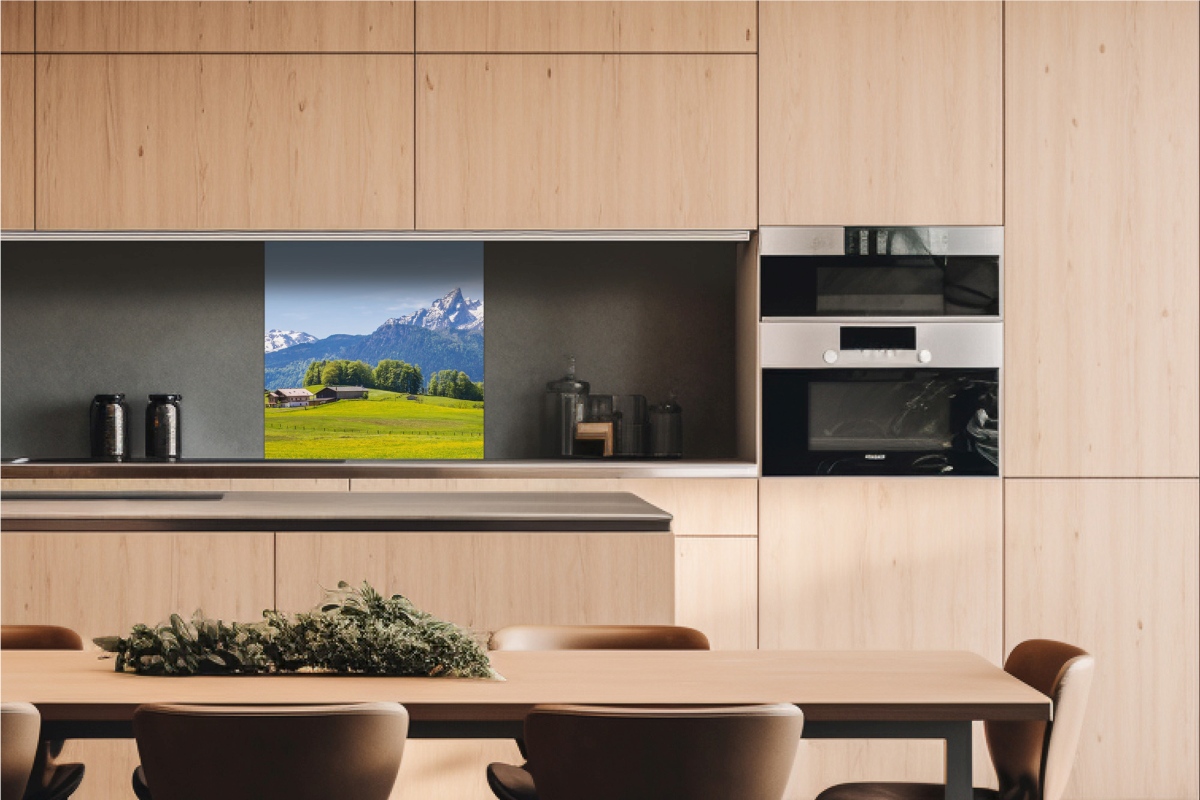 Dibond tábla a konyhapult mögött