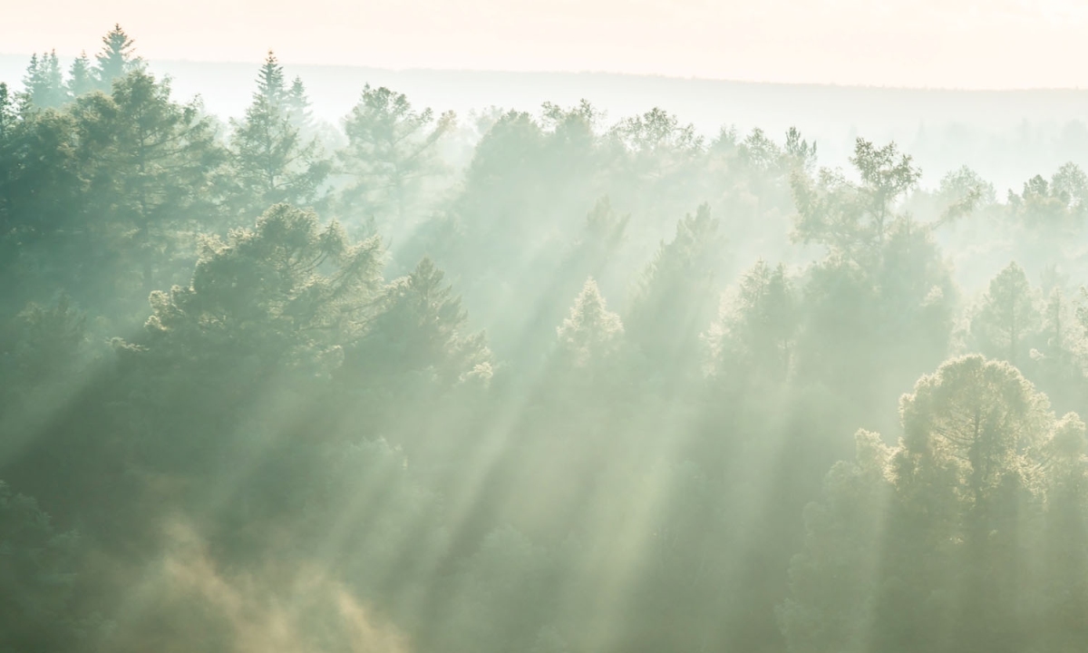Dibond tábla a konyhapult mögött A nap sugarai az erdő felett - 100 x 60 cm