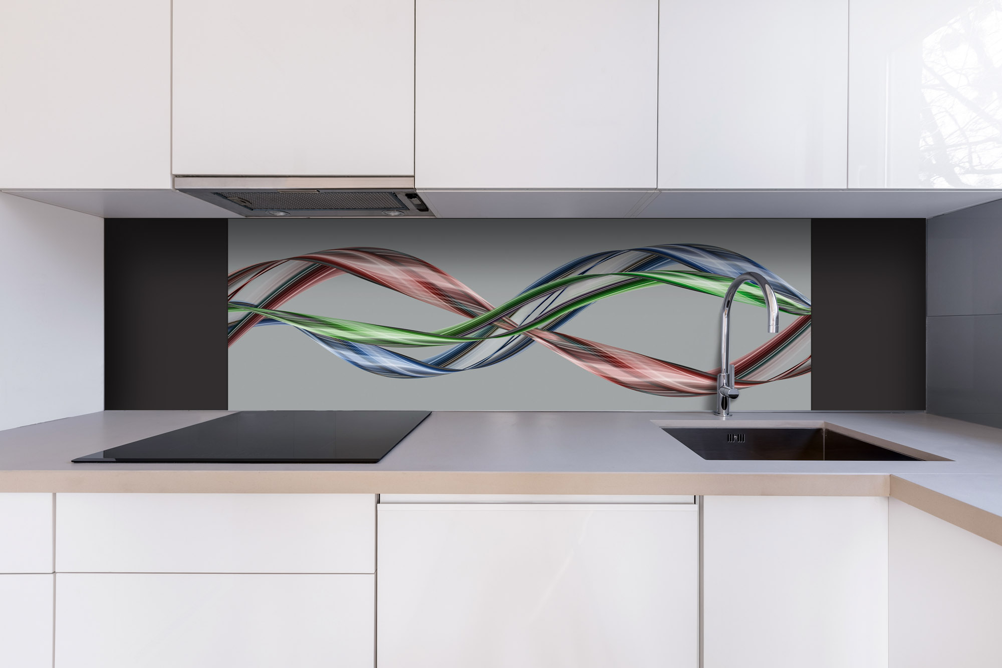 Dibond tábla a konyhapult mögött