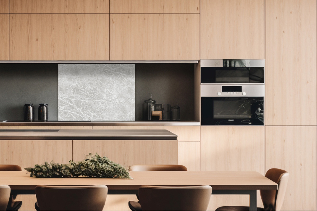 Dibond tábla a konyhapult mögött