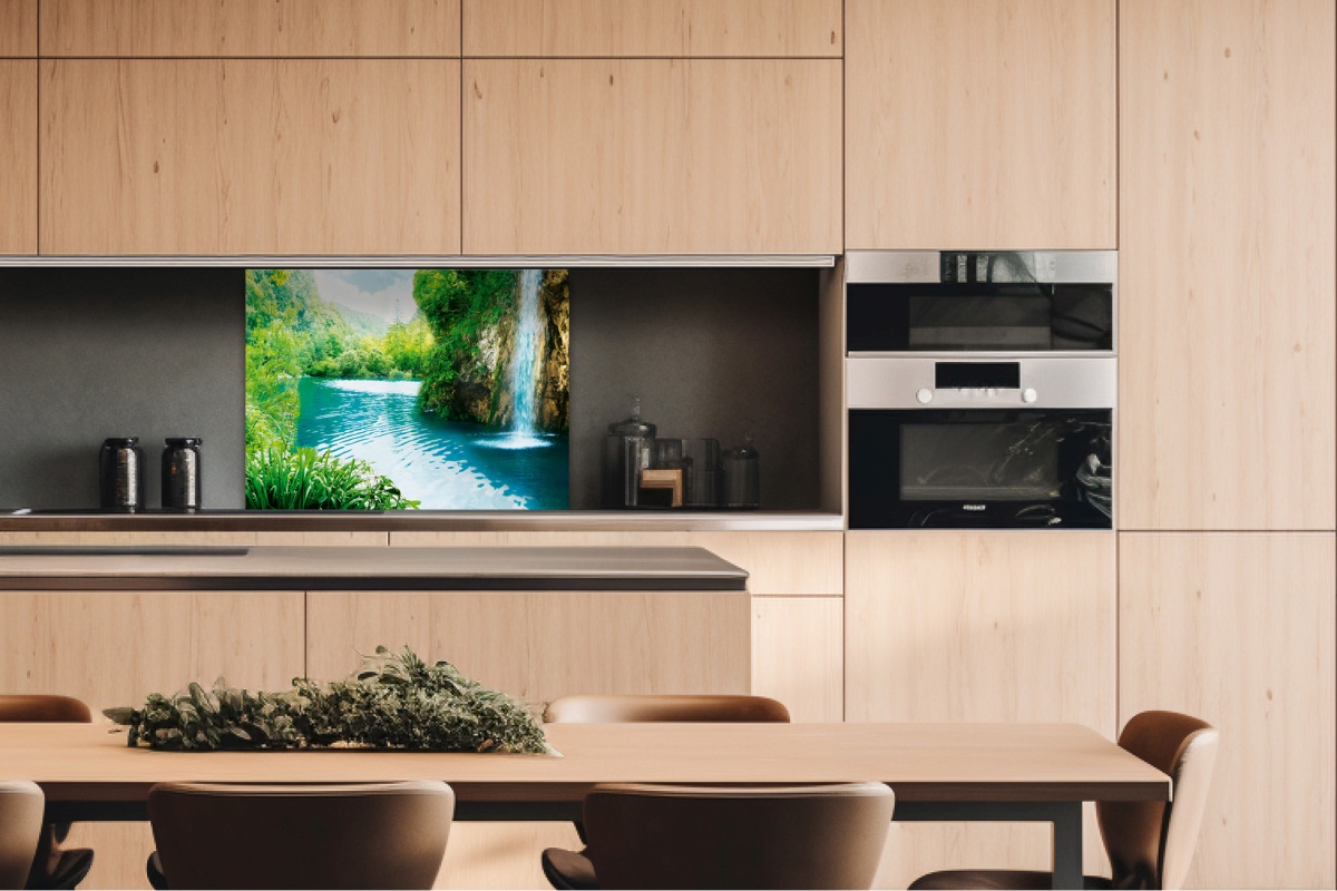 Dibond tábla a konyhapult mögött