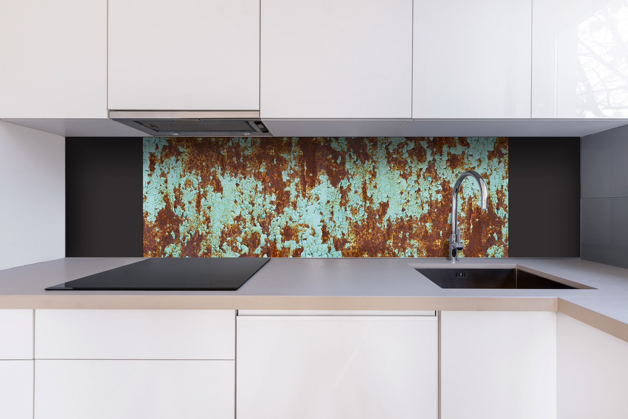 Dibond tábla a konyhapult mögött