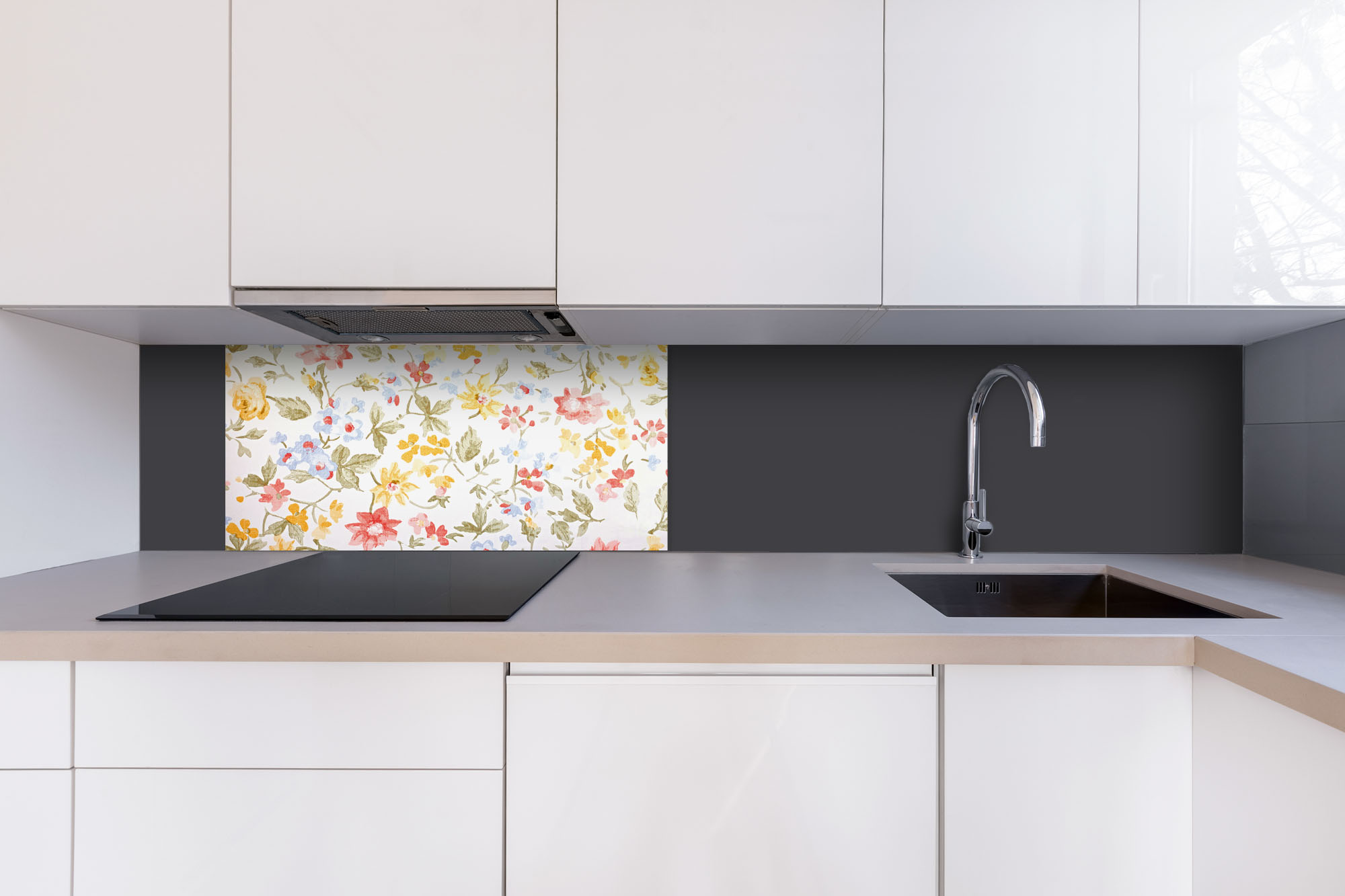 Dibond tábla a konyhapult mögött